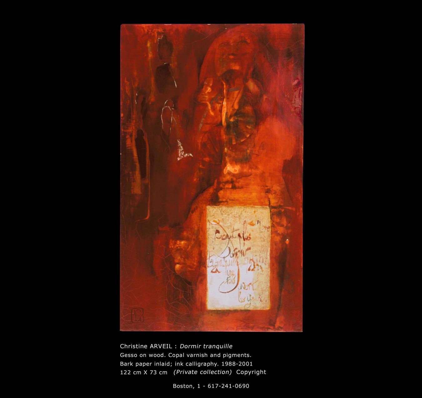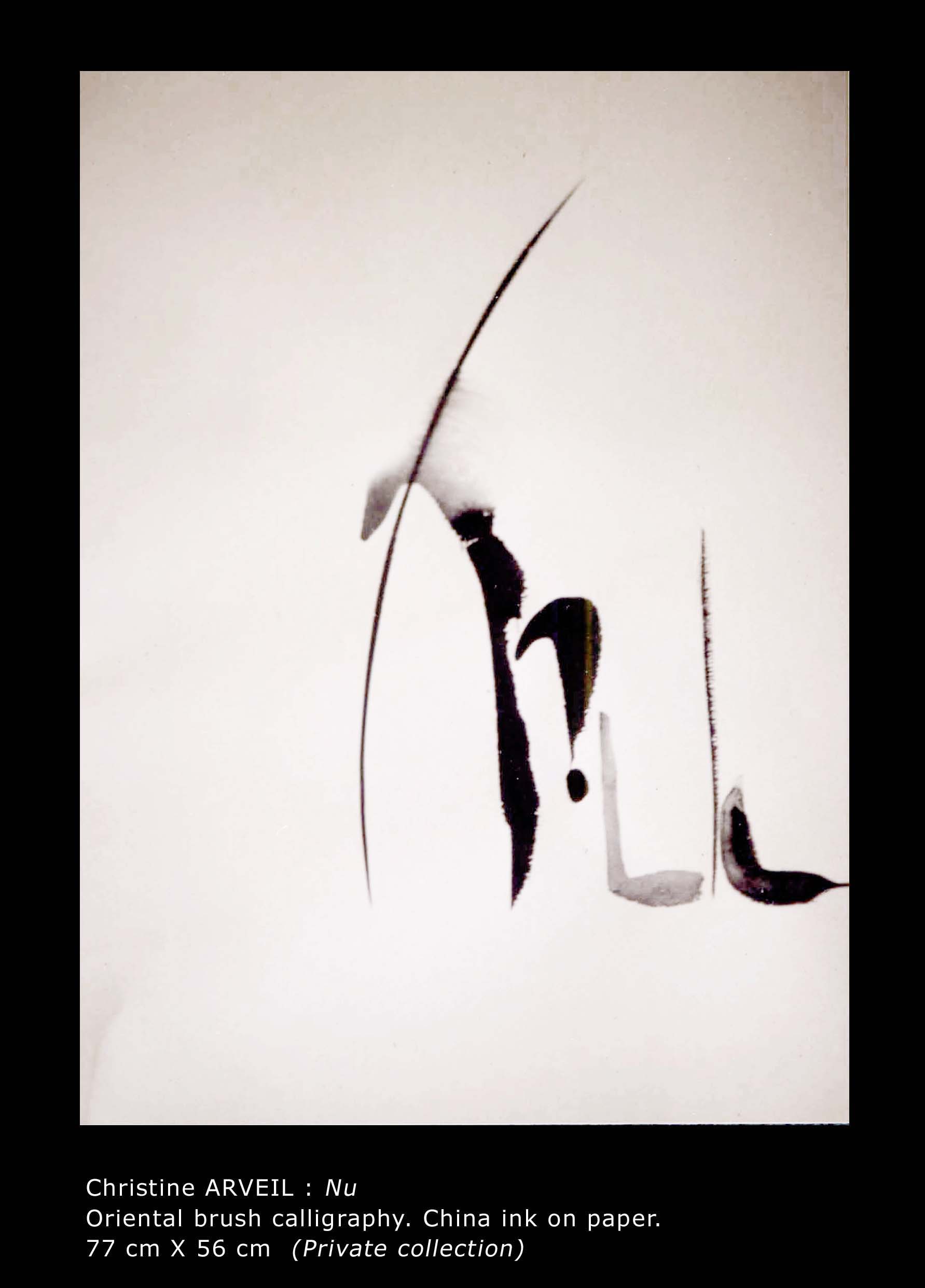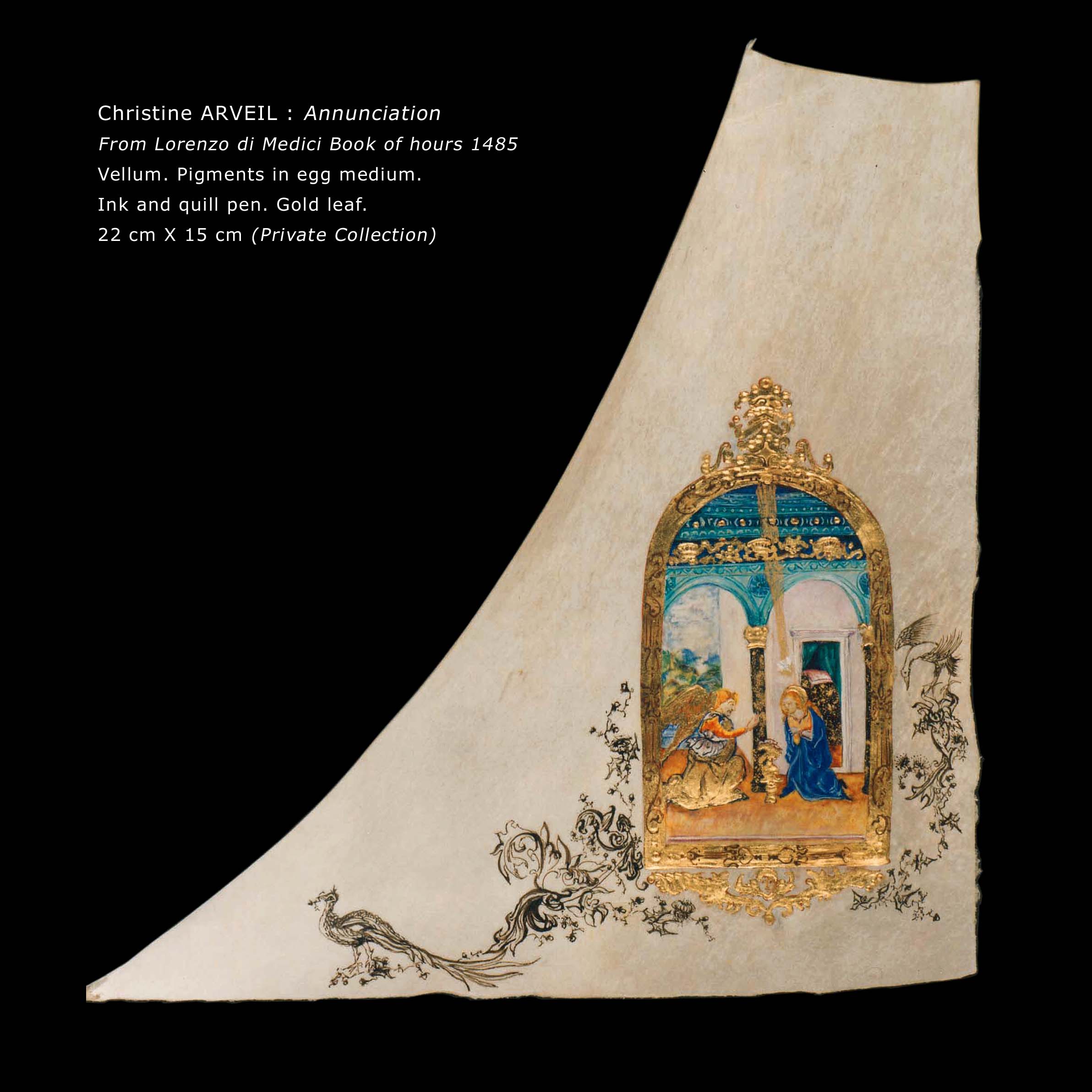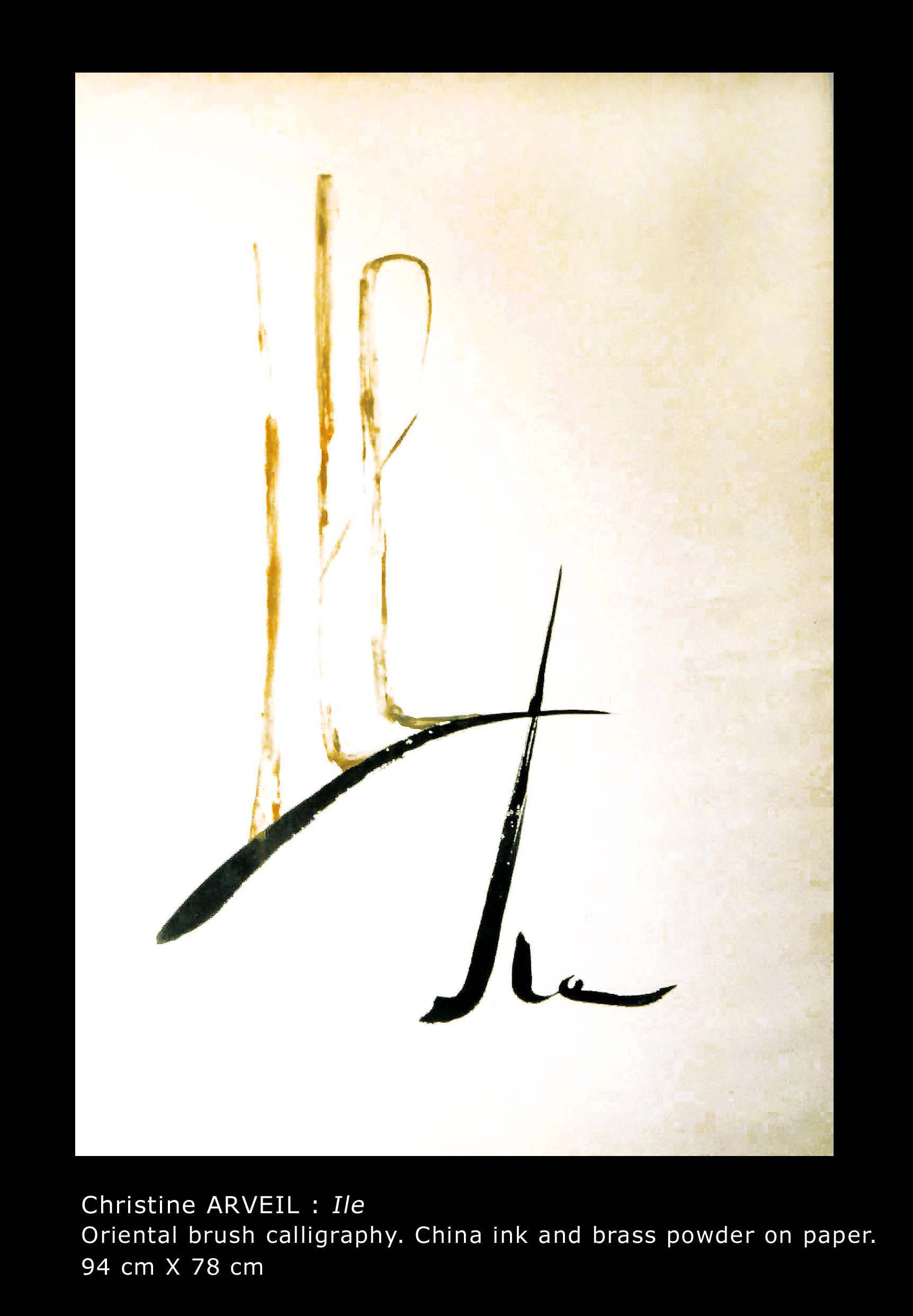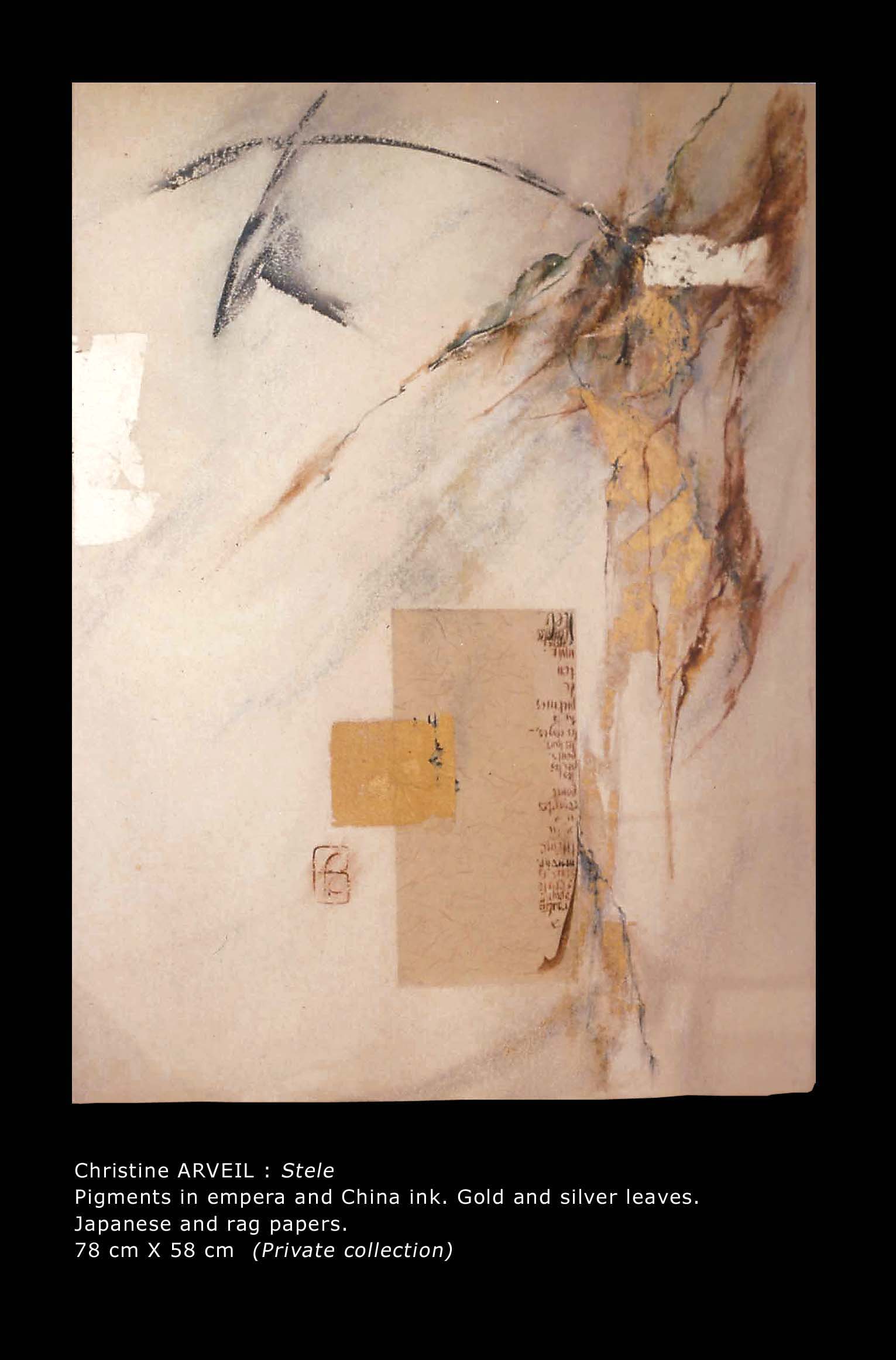 In the 1980s, Arveil embarked on a quest toward the foundations of painting, restricting herself for two years to stone-ground black ink on white paper. Single large words composed the solo show A mots roseaux, Paris, 1987. Arveil’s work was recognized the same year at the Japanese embassy’s Contemporary Calligraphy landmark exhibition. After this ascetic period, she reverted to colors prepared from dry pigments. Further delving into the European roots of painting, she reproduced medieval manuscript paintings (illumination) which she later taught at the Toledo Museum of Art, Ohio. Her replicas were featured in the 1994 Centre Pompidou exhibition Ecriture.