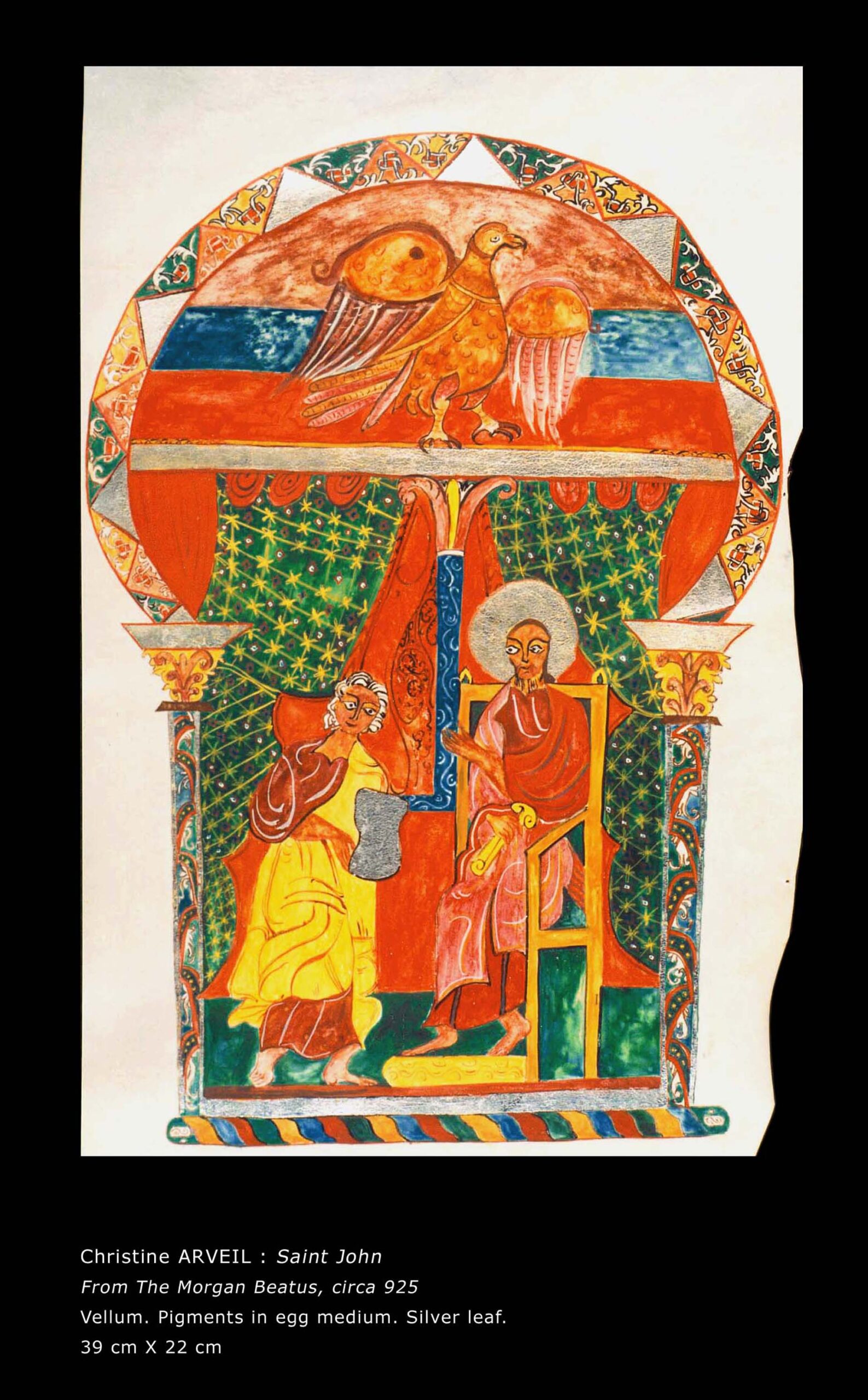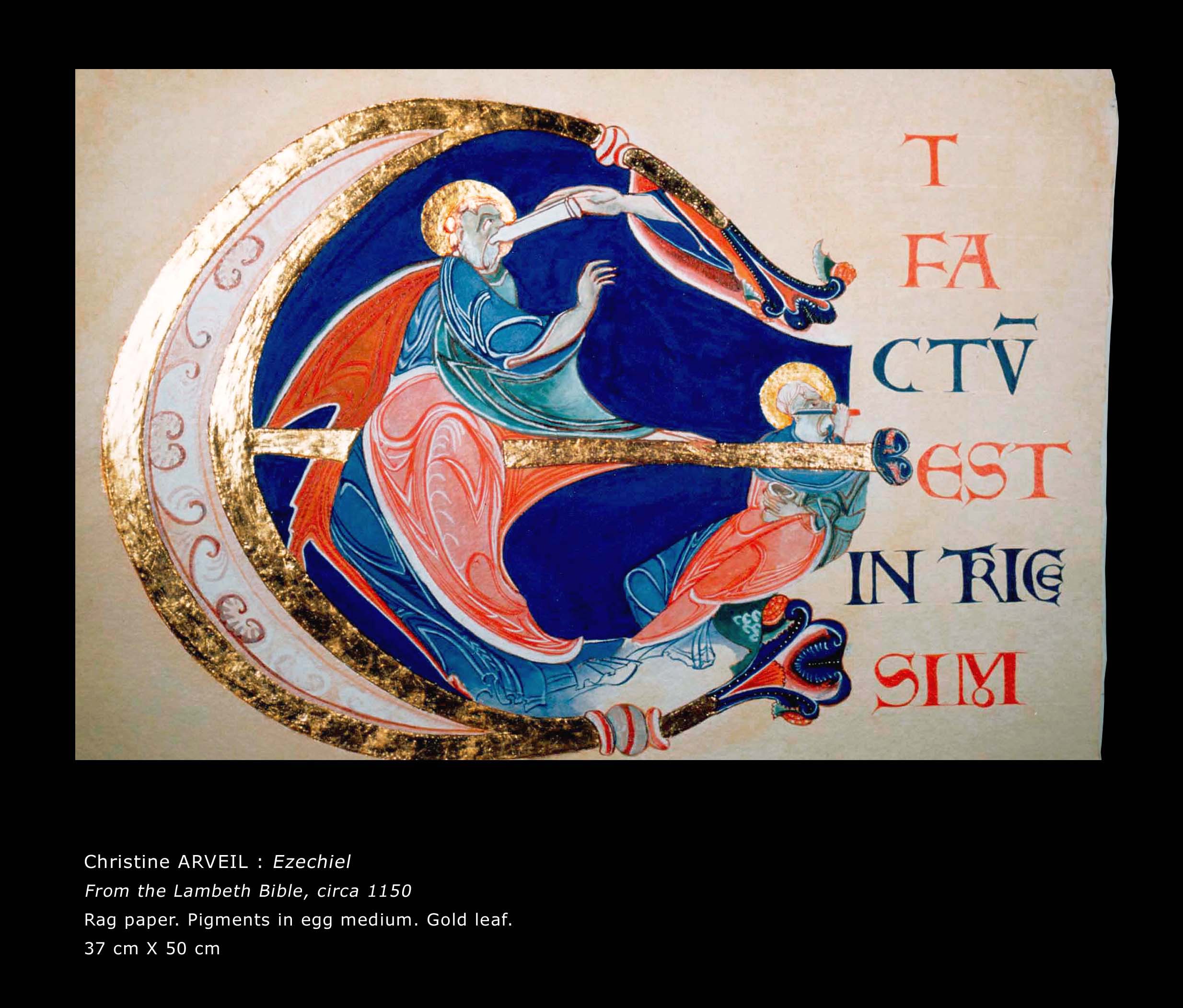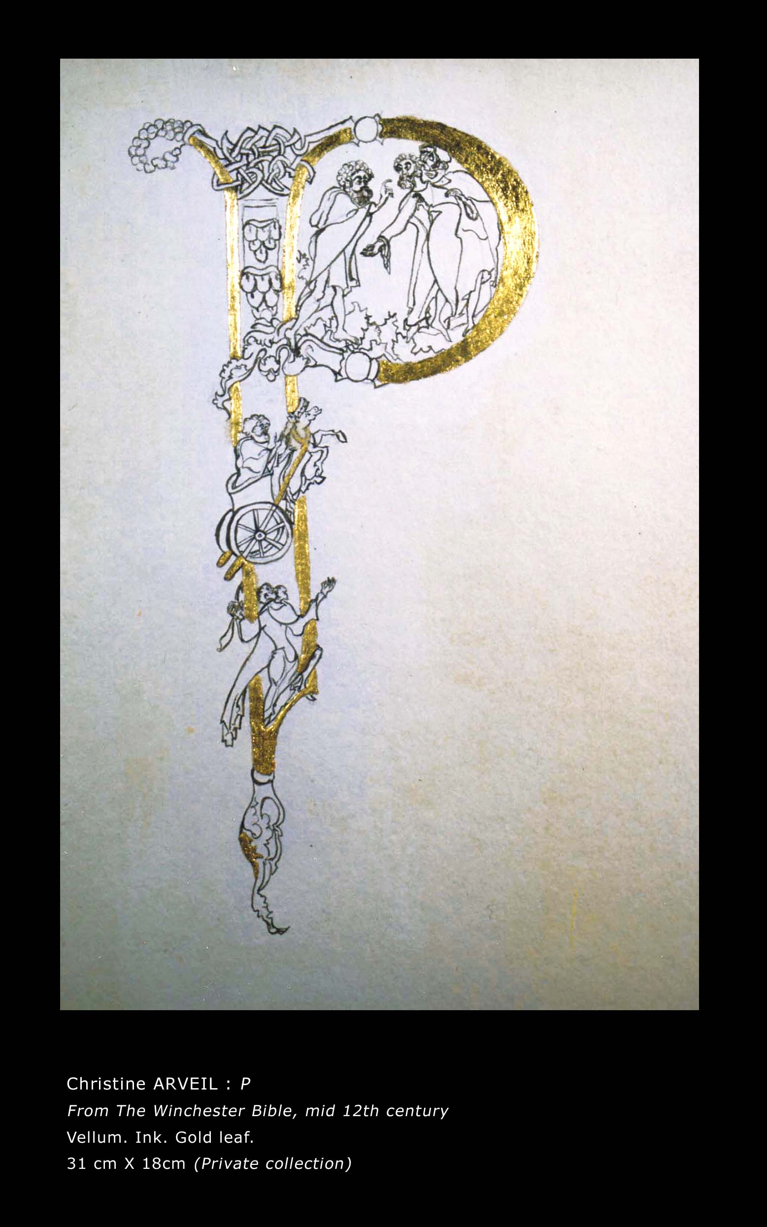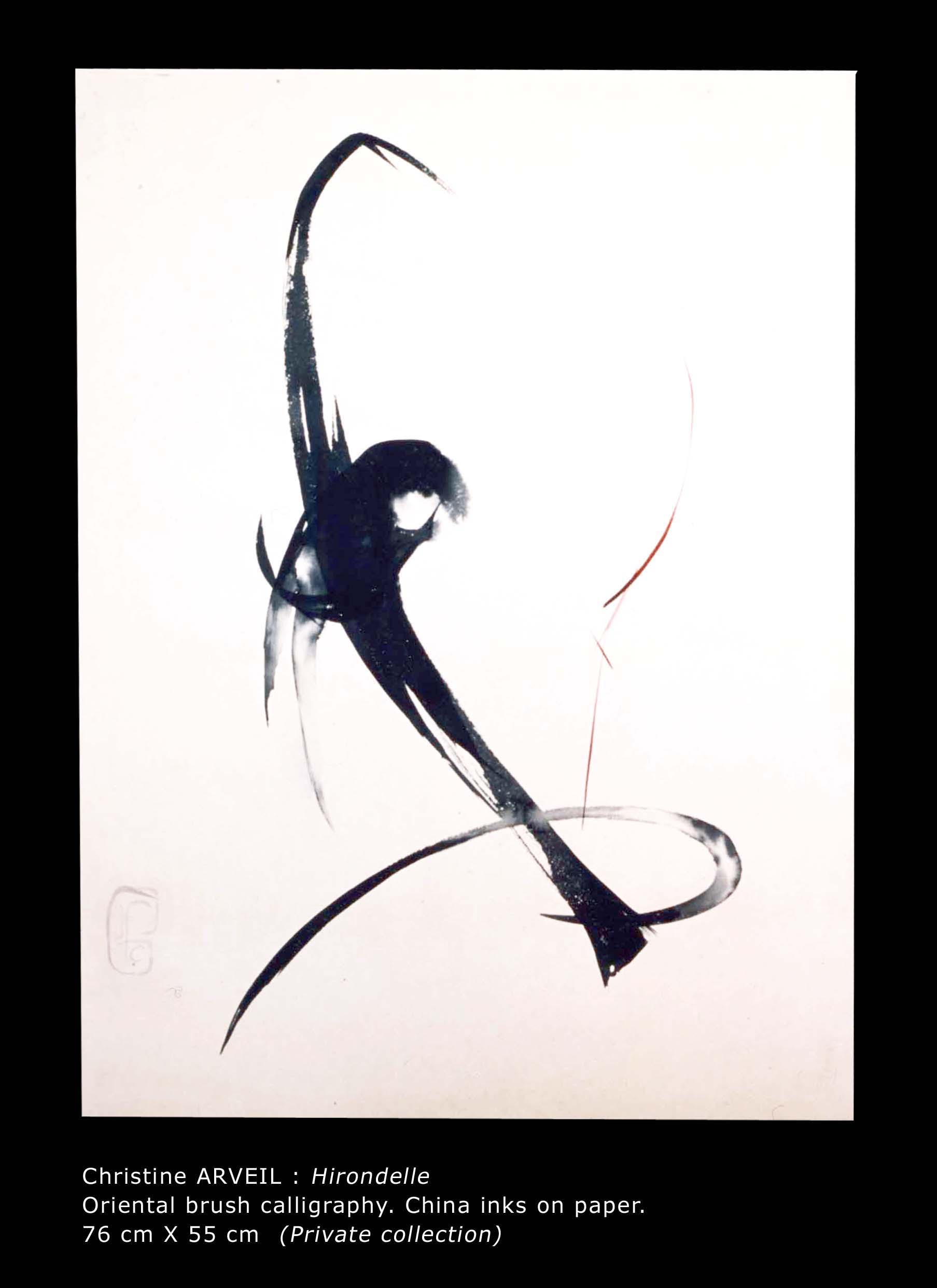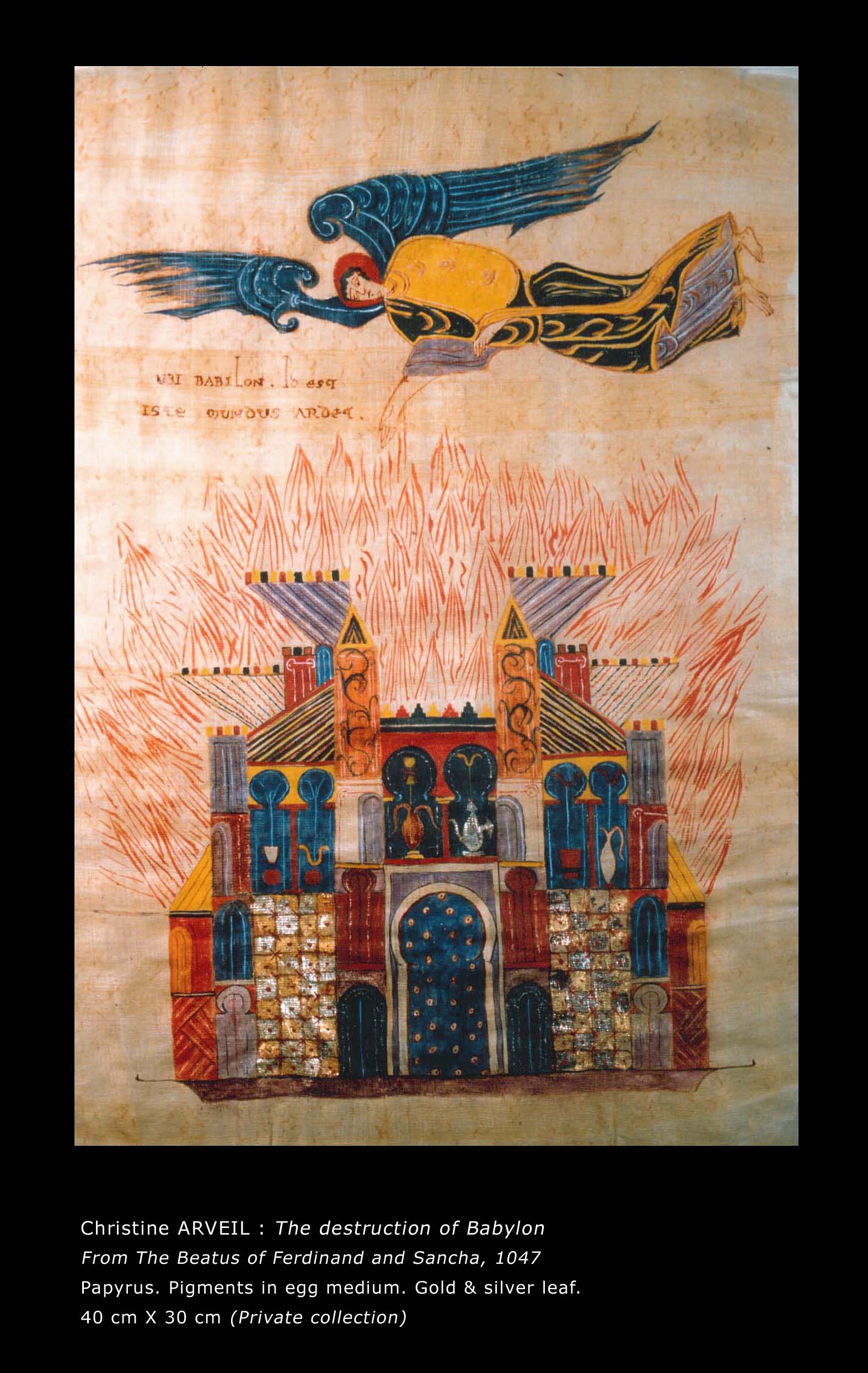 In the 1980s, Arveil embarked on a quest toward the foundations of painting, restricting herself for two years to stone-ground black ink on white paper. Single large words composed the solo show A mots roseaux, Paris, 1987. Arveil’s work was recognized the same year at the Japanese embassy’s Contemporary Calligraphy landmark exhibition. After this ascetic period, she reverted to colors prepared from dry pigments. Further delving into the European roots of painting, she reproduced medieval manuscript paintings (illumination) which she later taught at the Toledo Museum of Art, Ohio. Her replicas were featured in the 1994 Centre Pompidou exhibition Ecriture.