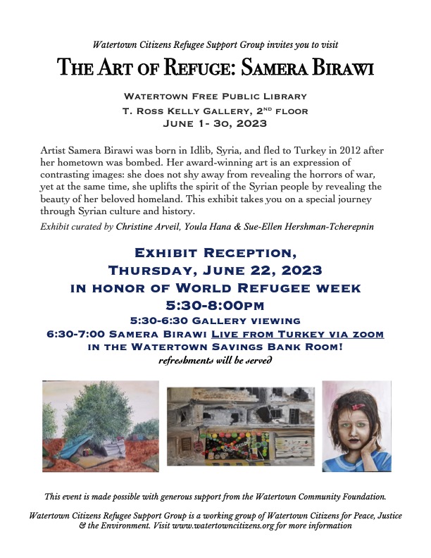 Curated the first American exhibition of Samira Birawi, in collaboration with Youla Hana, Refugee support group Leader, and Sue-Ellen Tcherepnin, President of Watertown Citizens for Peace, Justice and the Environment. The one-month show highlighted UN World Refugee Day.